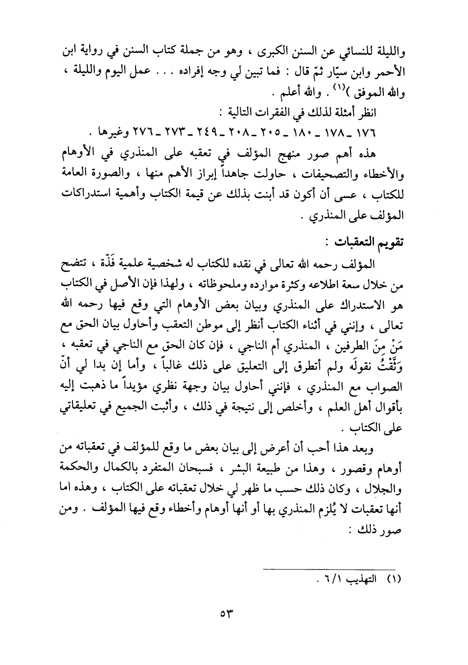 هذه أهم صور منهج المؤلف في تعقبه على المنذري في الأوهام والأخطاء والتصحيفات، حاولت جاهداً إبراز الأهم منها، والصورة العامة للكتاب، عسى أن أكون قد أبنت بذلك عن قيمة الكتاب وأهمية استدراكات المؤلف على المنذري.