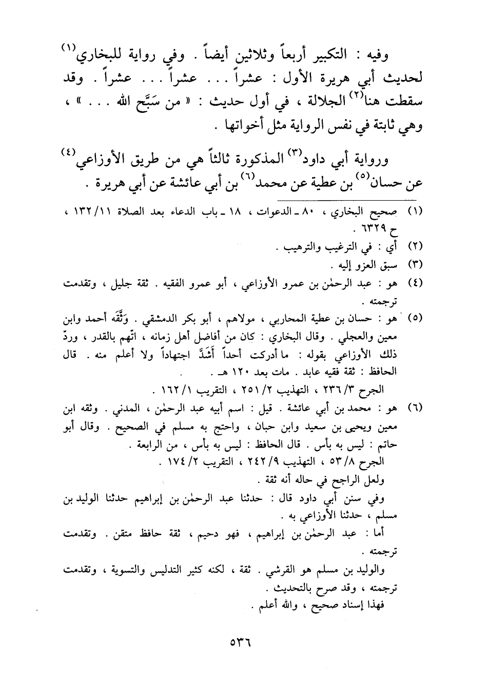 ورواية أبي داود المذكورة ثالثاً هي من طريق الأوزاعي عن حسان بن عطية عن محمد بن أبي عائشة عن أبي هريرة.