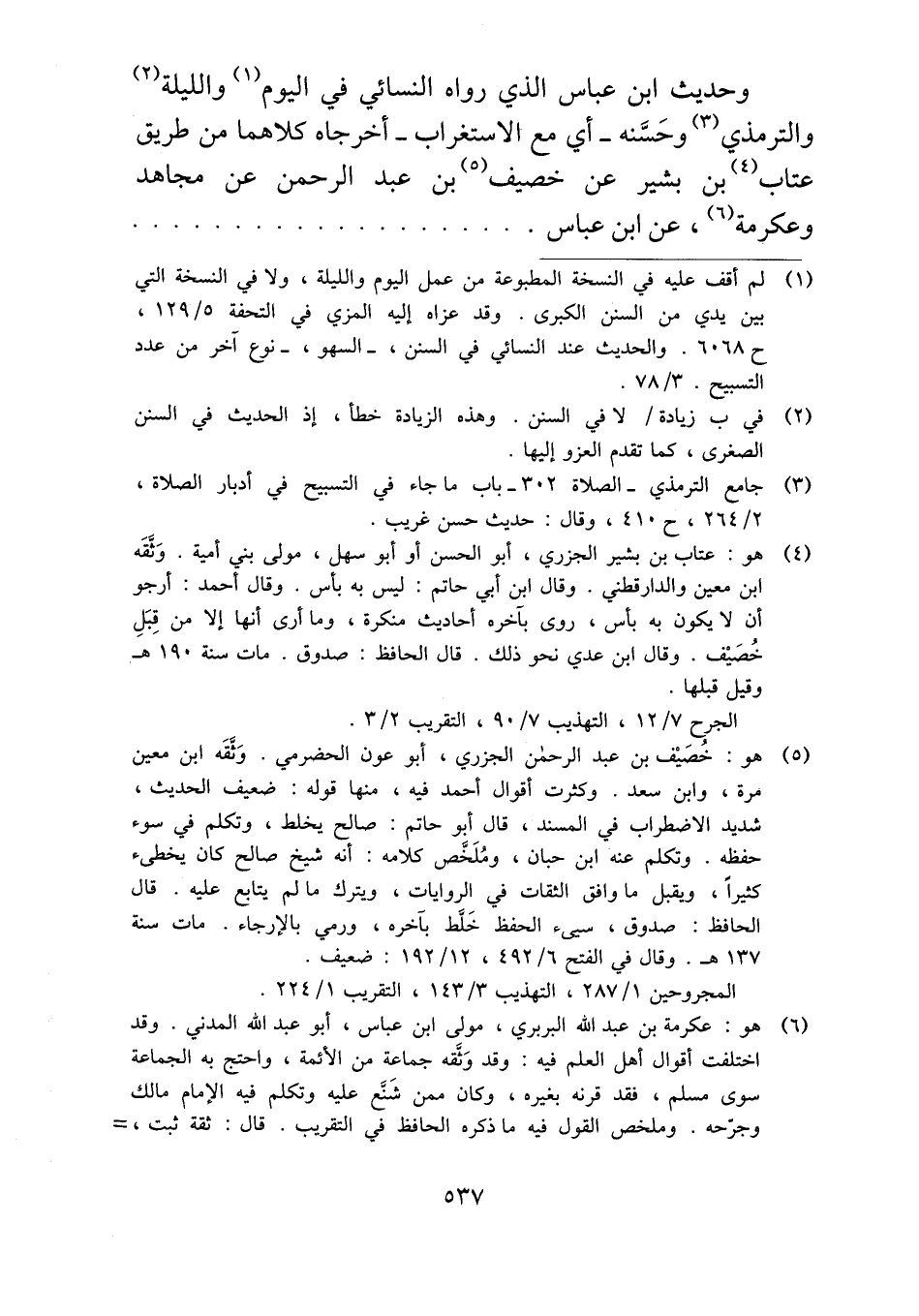 وحديث ابن عباس الذي رواه النسائي في اليوم والليلة والترمذي وحَسَّنه -أي مع الاستغراب- أخرجاه كلاهما من طريق عتاب بن بشير عن خصيف بن عبد الرحمن عن مجاهد وعكرمة، عن ابن عباس