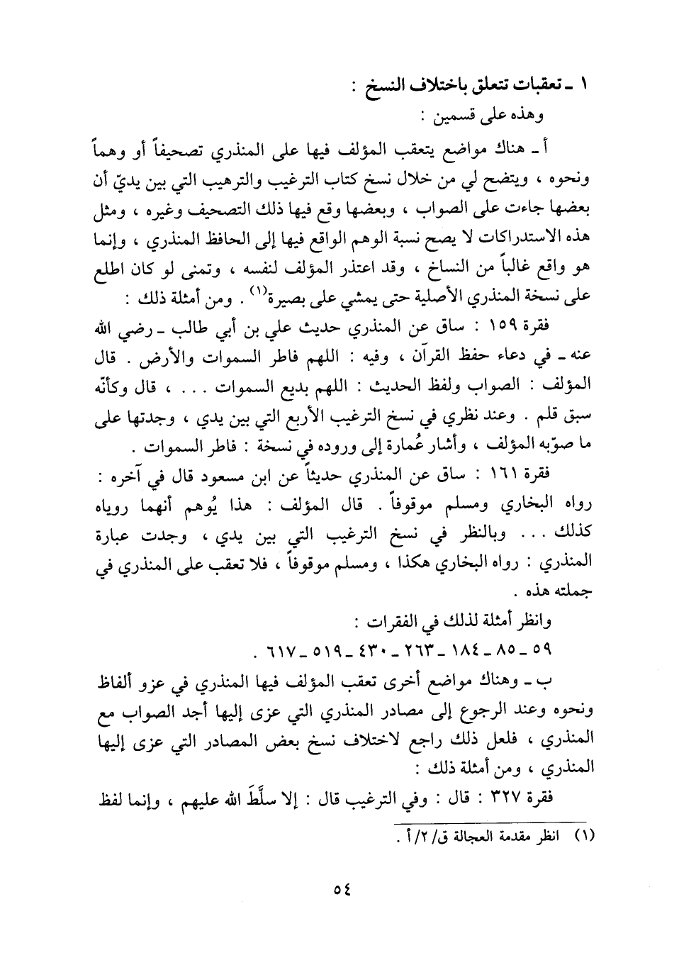 فقرة ١٦١: ساق عن المنذري حديثاً عن ابن مسعود قال في آخره: رواه البخاري ومسلم موقوفاً. قال المؤلف: هذا يُوهم أنهما روياه كذلك ... وبالنظر في نسخ الترغيب التي بين يدي، وجدت عبارة المنذري: رواه البخاري هكذا، ومسلم موقوفاً، فلا تعقب على المنذري في جملته هذه.