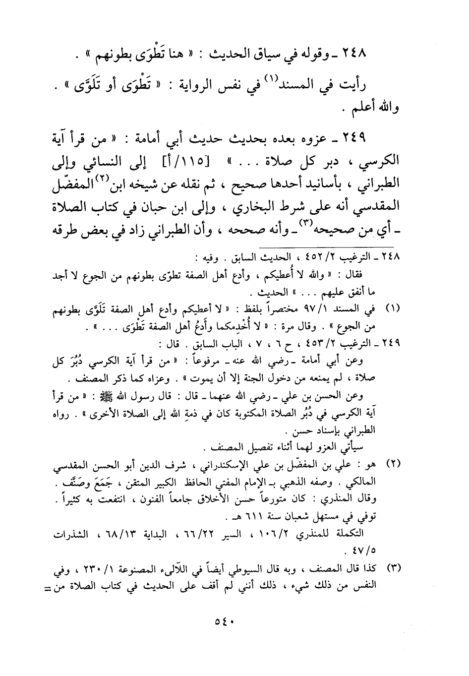 ٢٤٩ - عزوه بعده بحديث حديث أبي أمامة: "من قرأ آية الكرسي، دبر كل صلاة ... " إلى النسائي وإلى الطبراني، بأسانيد أحدها صحيح، ثم نقله عن شيخه ابن المفضّل المقدسي أنه على شرط البخاري، وإلى ابن حبان في كتاب الصلاة -أي من صحيحه - وأنه صححه، وأن الطبراني زاد في بعض طرقه