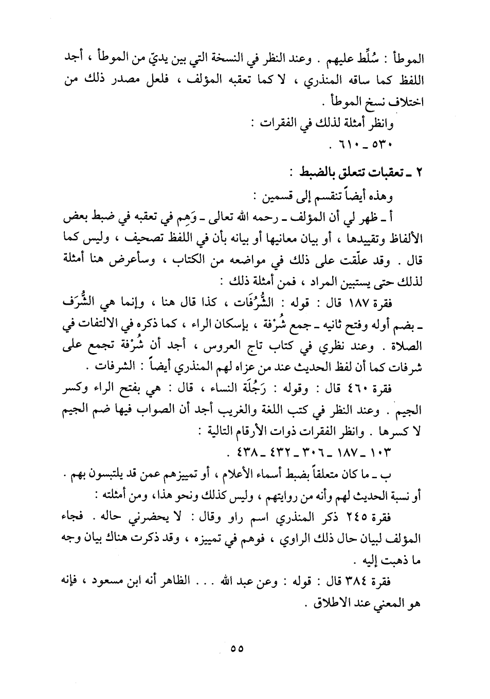 فقرة ١٨٧ قال: قوله: الشُّرُفَات، كذا قال هنا، وإنما هي الشُّرَف -بضم أوله وفتح ثانيه- جمع شُرْفة، بإسكان الراء، كما ذكره في الالتفات في الصلاة. وعند نظري في كتاب تاج العروس، أجد أن شُرْفة تجمع على شرفات كما أن لفظ الحديث عند من عزاه لهم المنذري أيضاً: الشرفات.