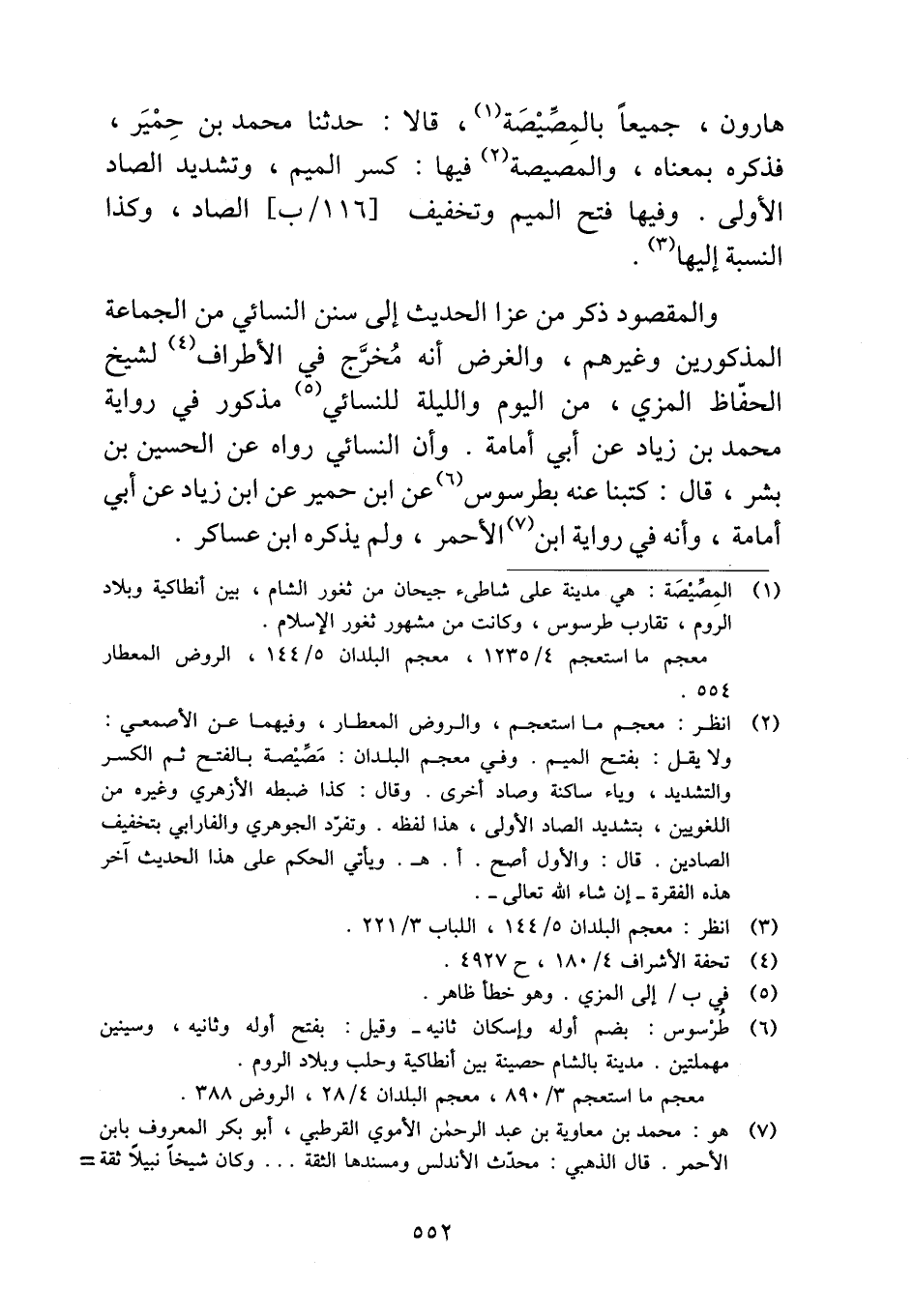 هارون، جميعاً بالمِصِّيْصَة، قالا: حدثنا محمد بن حِمْيَر، فذكره بمعناه، والمصيصة فيها: كسر الميم، وتشديد الصاد الأولى. وفيها فتح الميم وتخفيف الصاد، وكذا النسبة إليها.