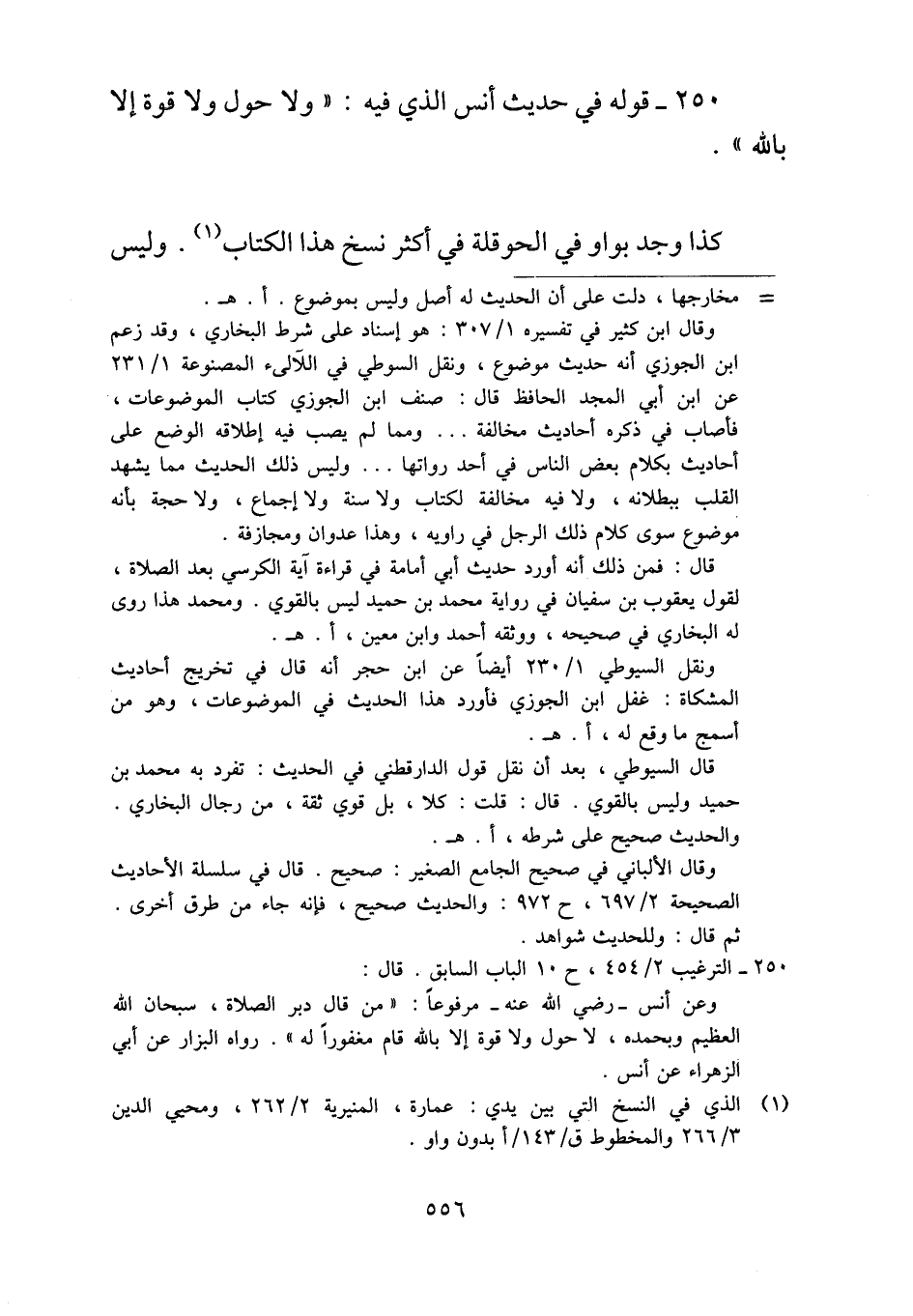 ٢٥٠ - قوله في حديث أنس الذي فيه: "ولا حول ولا قوة إلا بالله".