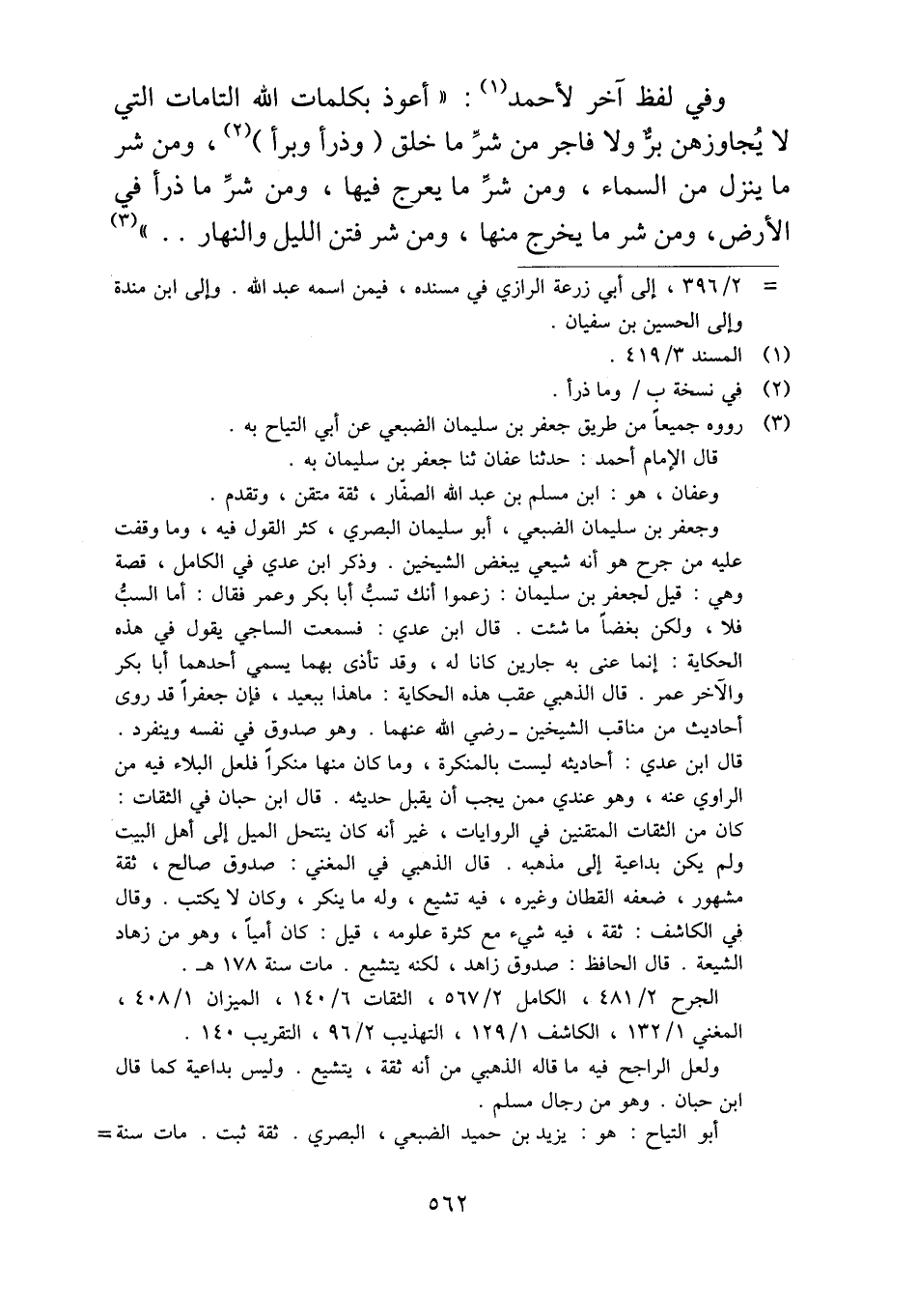 وفي لفظ آخر لأحمد: "أعوذ بكلمات الله التامات التي لا يُجاوزهن برٌّ ولا فاجر من شرِّ ما خلق (وذرأ وبرأ)، ومن شر ما ينزل من السماء، ومن شرِّ ما يعرج فيها، ومن شرِّ ما ذرأ في الأرض، ومن شر ما يخرج منها، ومن شر فتن الليل والنهار .. ".