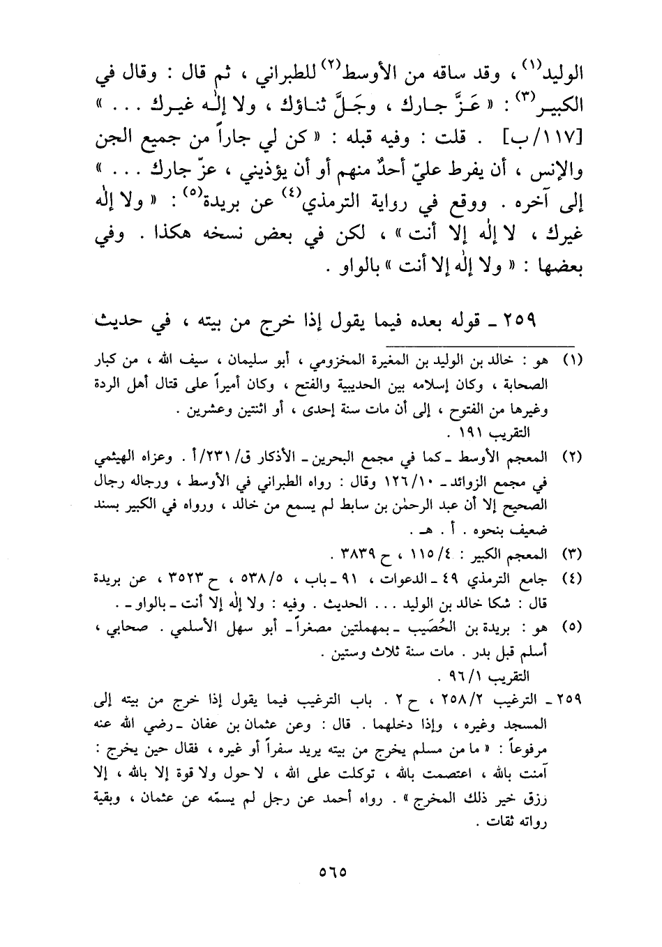 الوليد، وقد وساقه من الأوسط للطبراني، ثم قال: وقال في الكبير: "عَزَّ جارك، وجَلَّ ثناؤك، ولا إله غيرك ... ". قلت: وفيه قبله: "كن لي جاراً من جميع الجن والإنس، أن يفرط عليّ أحدٌ منهم أو أن يؤذيني، عزّ جارك ... " إلى آخره. ووقع في رواية الترمذي عن بريدة: "ولا إله غيرك، لا إله إلا أنت"، لكن في بعض نسخه هكذا. وفي بعضها: "ولا إله إلا أنت" بالواو.