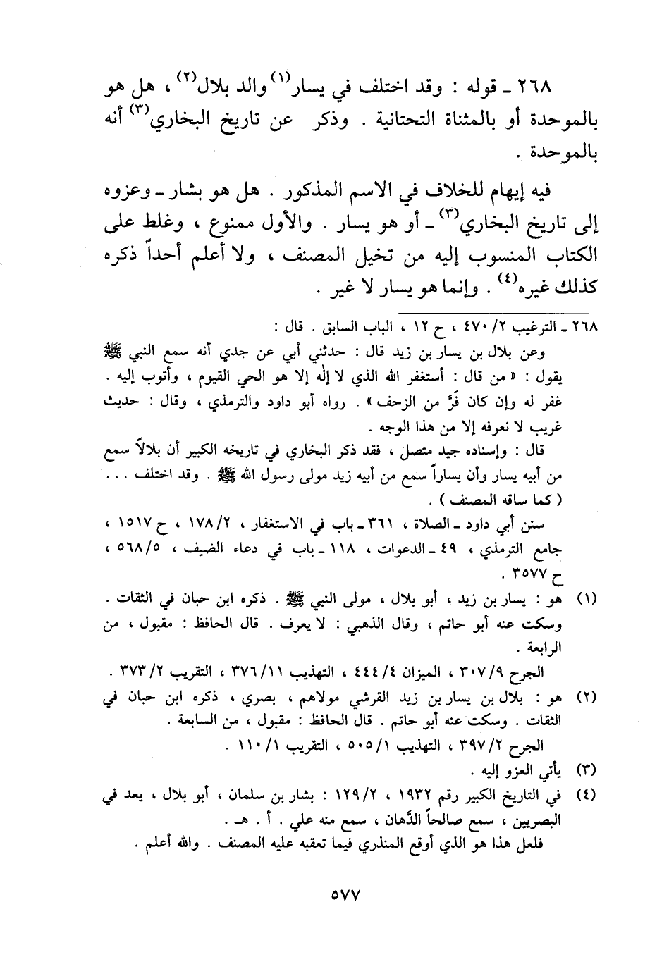 ٢٦٨ - قوله: وقد اختلف في يسار والد بلال، هل هو بالموحدة أو بالمثناة التحتانية. وذكر عن تاريخ البخاري أنه بالموحدة.