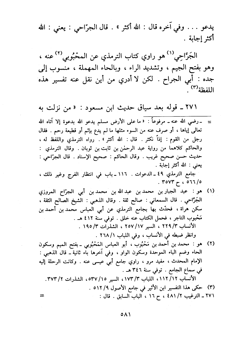 الجَرَّاحِي هو راوي كتاب الترمذي عن المحْبُوبي عنه، وهو بفتح الجيم، وتشديد الراء، وبالحاء المهملة، منسوب إلى جده: أبي الجراح. لكن لا أدري من أين نقل عنه تفسير هذه اللفظة.