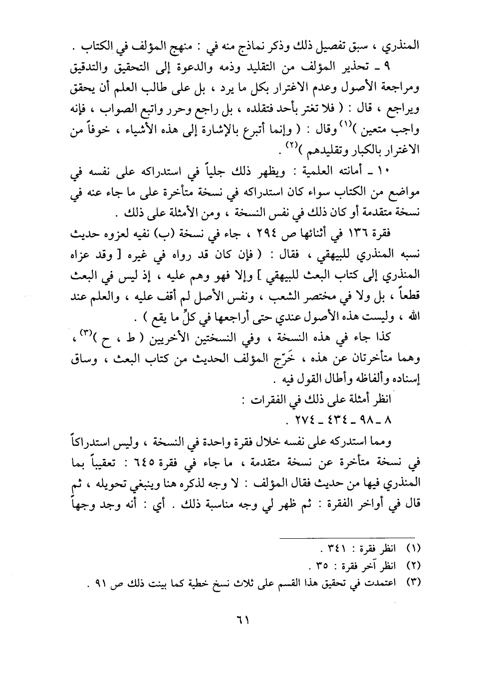 فقرة ١٣٦ في أثنائها ص ٢٩٤، جاء في نسخة (ب) نفيه لعزوه حديث نسبه المنذري للبيهقي، فقال: (فإن كان قد رواه في غيره [وقد عزاه المنذري إلى كتاب البعث للبيهقي] وإلا فهو وهم عليه، إذ ليس في البعث قطعاً، بل ولا في مختصر الشعب، ونفس الأصل لم أقف عليه، والعلم عند الله، وليست هذه الأصول عندي حتى أراجعها في كلِّ ما يقع).