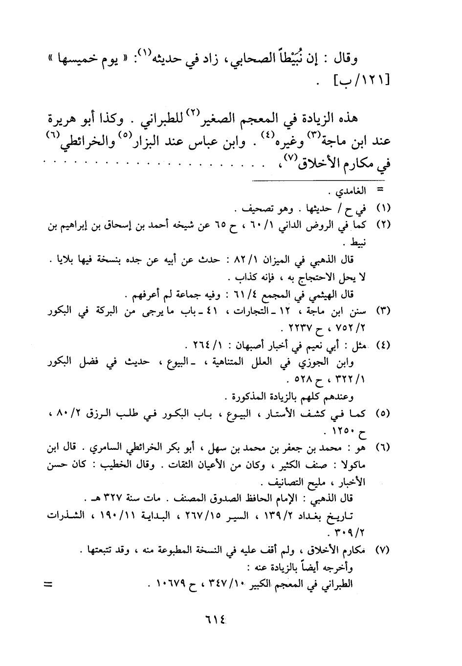 وقال: إن نُبَيْطاً الصحابي، زاد في حديثه: "يوم خميسها".