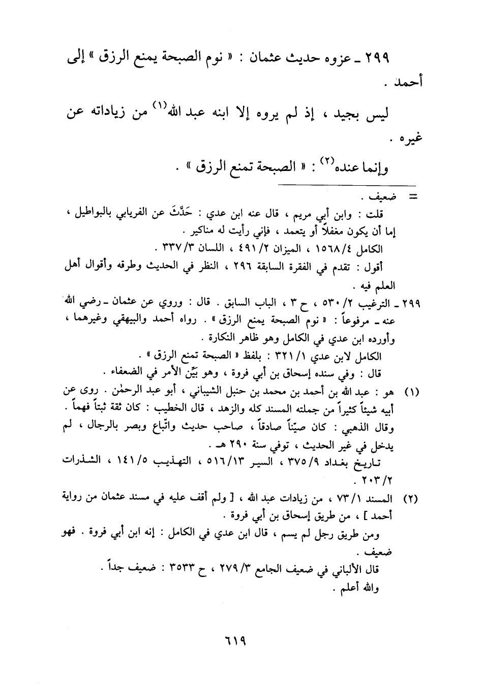 ٢٩٩ - عزوه حديث عثمان: "نوم الصبحة يمنع الرزق" إلى أحمد.