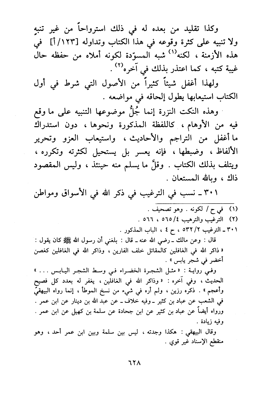 وكذا تقليد من بعده له في ذلك استرواحاً من غير تنبهٍ ولا تنبيه على كثرة وقوعه في هذا الكتاب وتداوله في هذه الأزمنة، لكنه شبه المسوّدة لكونه أملاه من حفظه حال غيبة كتبه، كما اعتذر بذلك في آخره.