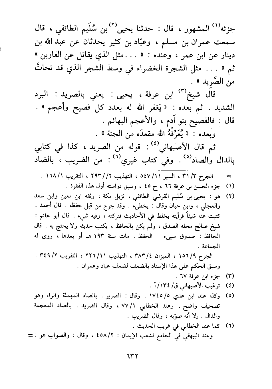 جزئه المشهور، قال: حدثنا يحيى بن سُلَيم الطائفي، قال سمعت عمران بن مسلم، وعبّاد بن كثير يحدثان عن عبد الله بن دينار عن ابن عمر، وعنده: " ... مثل الذي يقاتل عن الفارين" ثم " ... مثل الشجرة الخضراء في وسط الشجر الذي قد تحاتَّ من الصَّرِيد".