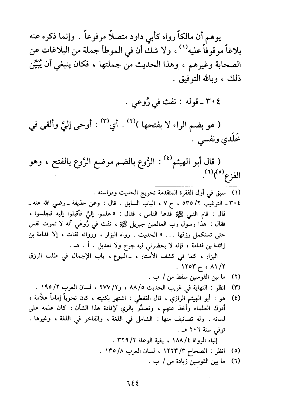 يوهم أن مالكاً رواه كأبي داود متصلاً مرفوعاً. وإنما ذكره عنه بلاغاً موقوفاً عليه , ولا شك أن في الموطأ جملة من البلاغات عن الصحابة وغيرهم، وهذا الحديث من جملتها، فكان ينبغي أن يُبَيِّن ذلك، وبالله التوفيق.