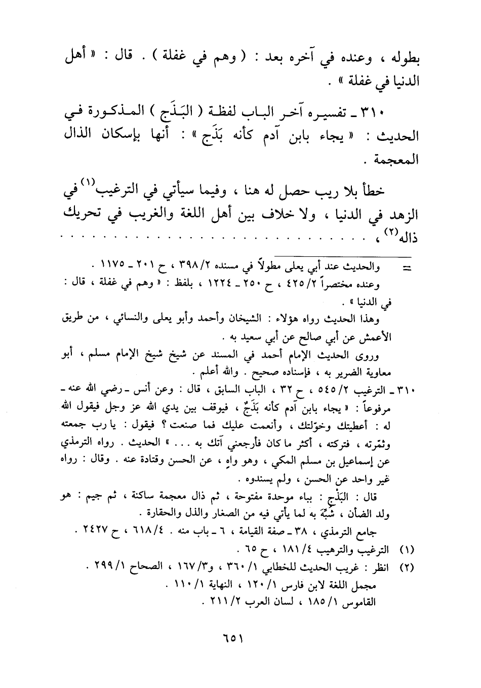 ٣١٠ - تفسيره آخر الباب لفظة (البَذَج) المذكورة في الحديث: "يجاء بابن آدم كأنه بَذَج": أنها بإسكان الذال المعجمة.