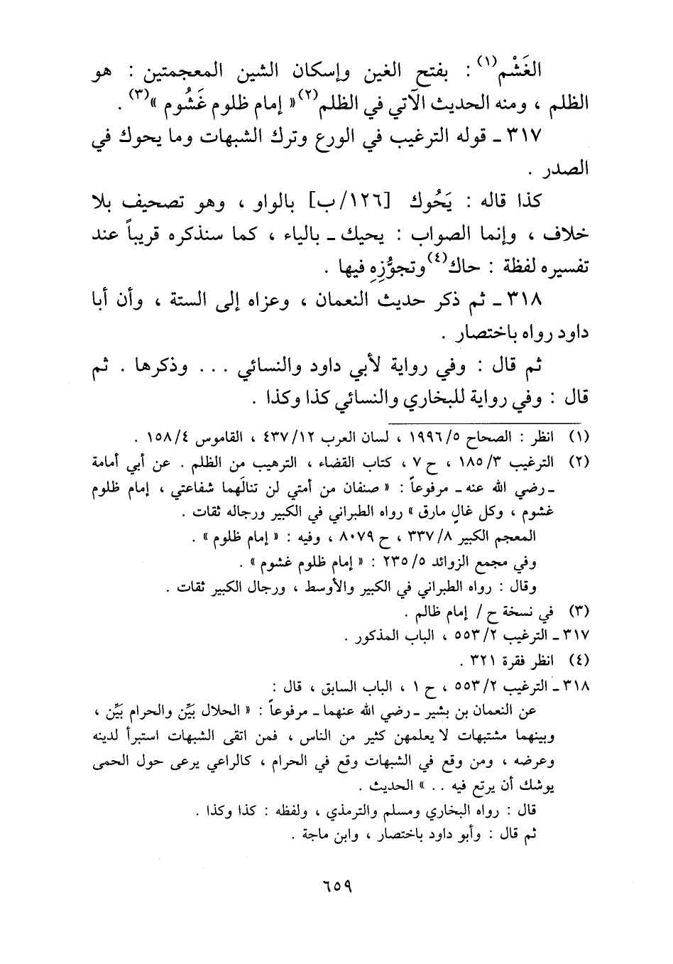 ٣١٨ - ثم ذكر حديث النعمان، وعزاه إلى الستة، وأن أبا داود رواه باختصار.
