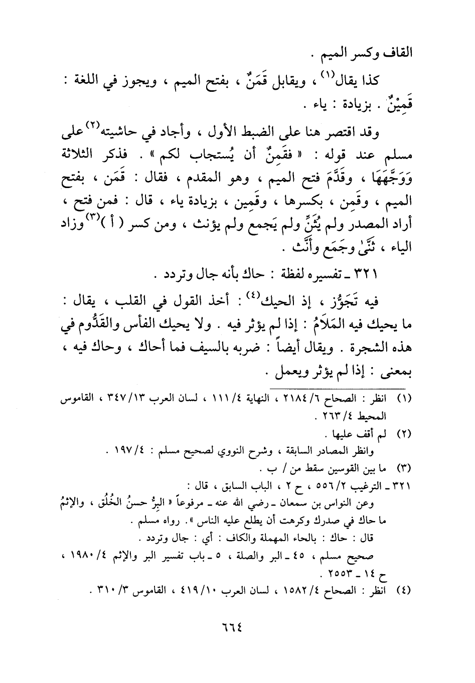 وقد اقتصر هنا على الضبط الأول، وأجاد في حاشيته على مسلم عند قوله: "فقَمِنٌ أن يُستجاب لكم". مذكر الثلاثة وَوَجَّهَهَا، وقَدَّمَ فتح الميم، وهو المقدم، فقال: قَمَن، بفتح الميم، وقَمِن، بكسرها، وقَمِين، بزيادة ياء، قال: فمن فتح، أراد المصدر ولم يُئَنِّ ولم يَجمع ولم يؤنث، ومن كسر (أ) وزاد الياء، ثنَّى وجَمَع وأَنّث.