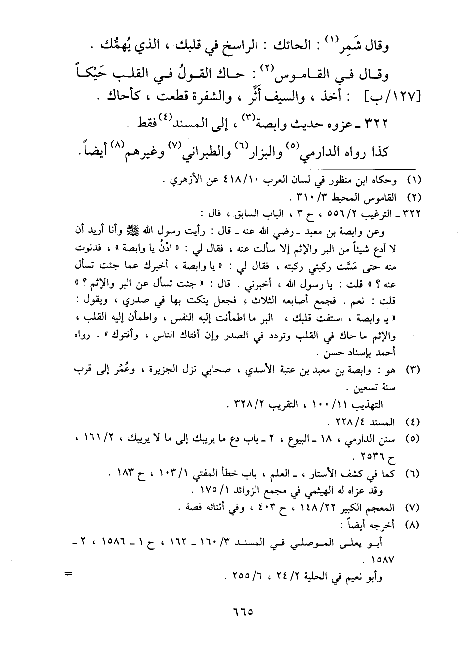 ٣٢٢ - عزوه حديث وابصة، إلى المسند فقط.