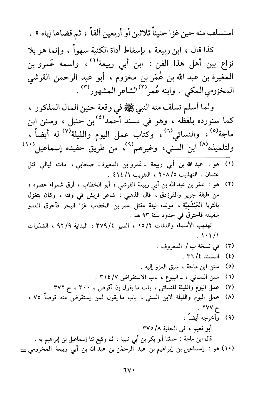 ولما أسلم تسلف منه النبي - صلى الله عليه وسلم - في وقعة حنين المال المذكور، كما سنورده بلفظه، وهو في مسند أحمد بن حنبل، وسنن ابن ماجة، والنسائي، وكتاب عمل اليوم والليلة له أيضاً، ولتلميذه ابن السني، وغيرهم، من طريق حفيده إسماعيل