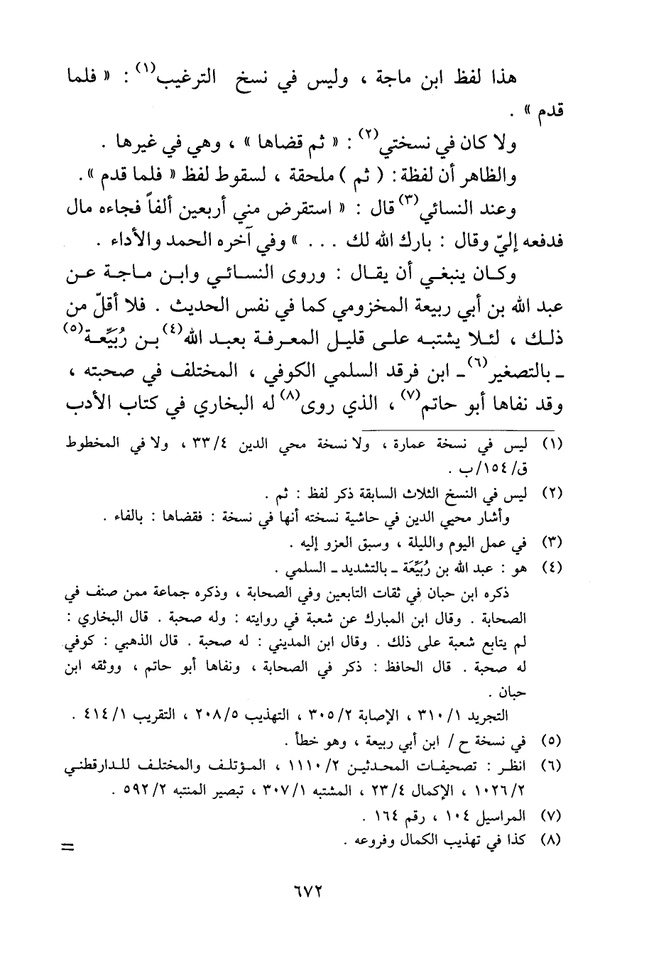 وكان ينبغي أن يقال: وروى النسائي وابن ماجة عن عبد الله بن أبي ربيعة المخزومي كما في نفس الحديث. فلا أقلّ من ذلك، لئلا يشتبه على قليل المعرفة بعبد الله بن رُبيِّعة -بالتصغير- ابن فرقد السلمي الكوفي، المختلف في صحبته، وقد نفاها أبو حاتم , الذي روى له البخاري في كتاب الأدب