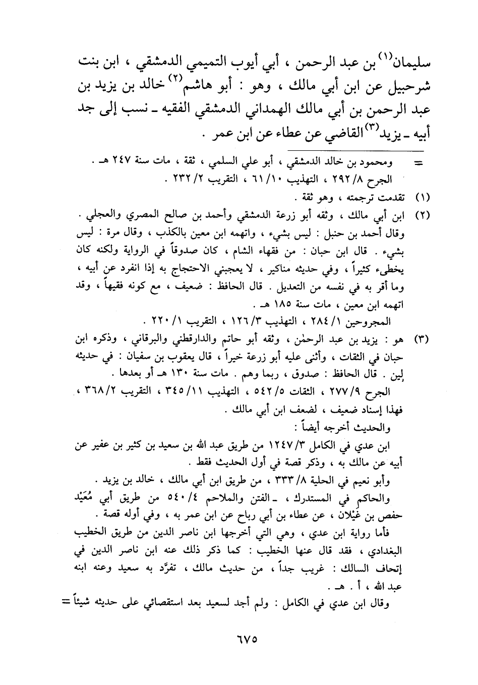سليمان بن عبد الرحمن، أبي أيوب التميمي الدمشقي، ابن بنت شرحبيل عن ابن أبي مالك، وهو: أبو هاشم خالد بن يزيد بن عبد الرحمن بن أبي مالك الهمداني الدمشقي الفقيه -نسب إلى جد أبيه- يزيد القاضي عن عطاء عن ابن عمر.