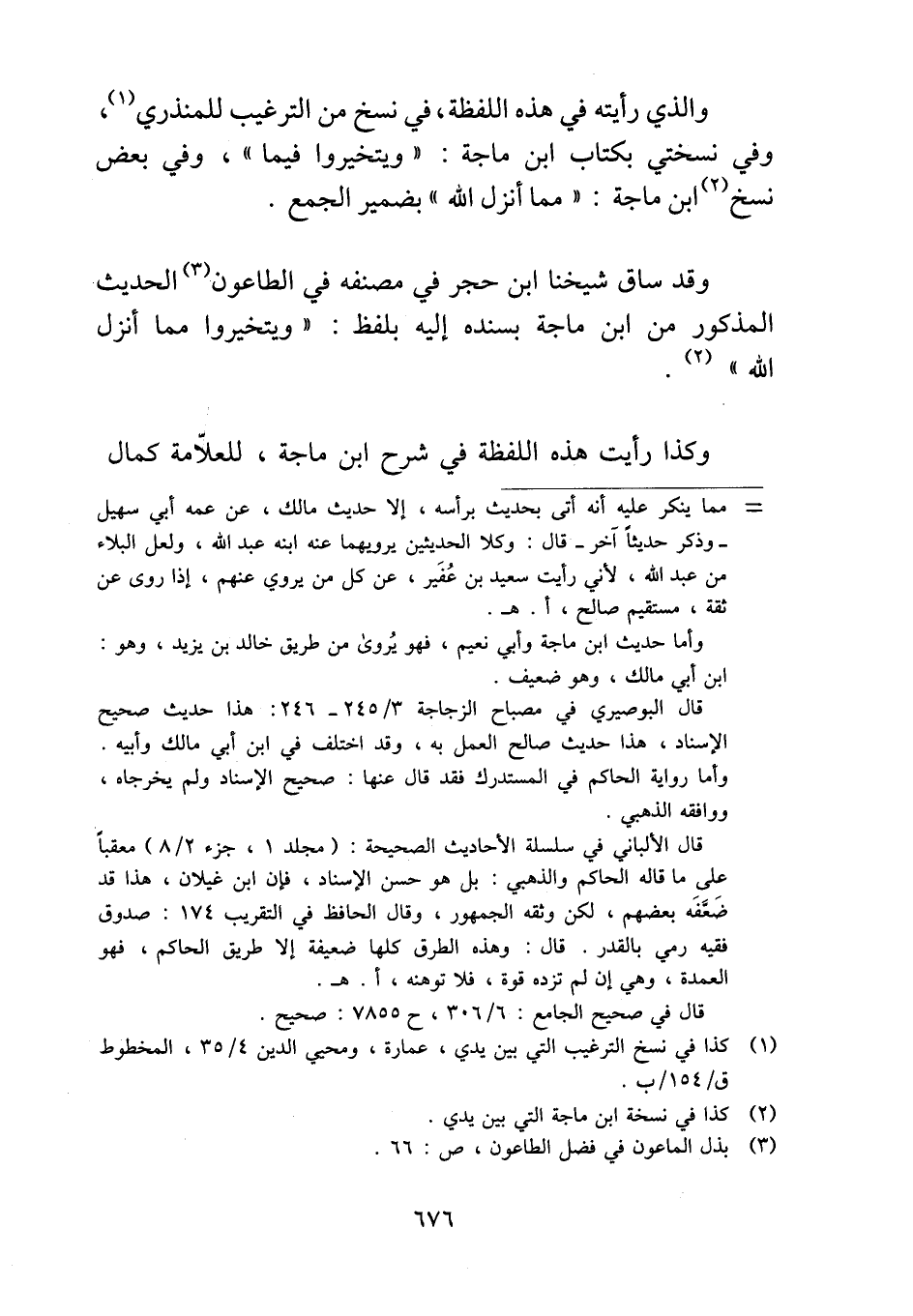 وقد ساق شيخنا ابن حجر في مصنفه في الطاعون الحديث المذكور من ابن ماجة بسنده إليه بلفظ: "ويتخيروا مما أنزل الله".