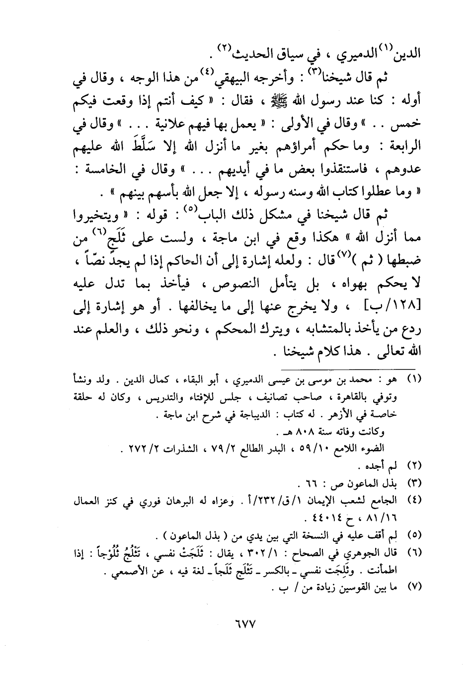 ثم قال شيخنا في مشكل ذلك الباب: قوله: "ويتخيروا مما أنزل الله" هكذا وقع في ابن ماجة، ولست على ثَلَجٍ من ضبطها (ثم) قال: ولعله إشارة إلى أن الحاكم إذا لم يجد نصّاً، لا يحكم بهواه، بل يتأمل النصوص، فيأخذ بما تدل عليه , ولا يخرج عنها إلى ما يخالفها. أو هو إشارة إلى ردع من يأخذ بالمتشابه، ويترك المحكم، ونحو ذلك، والعلم عند الله تعالى. هذا كلام شيخنا.