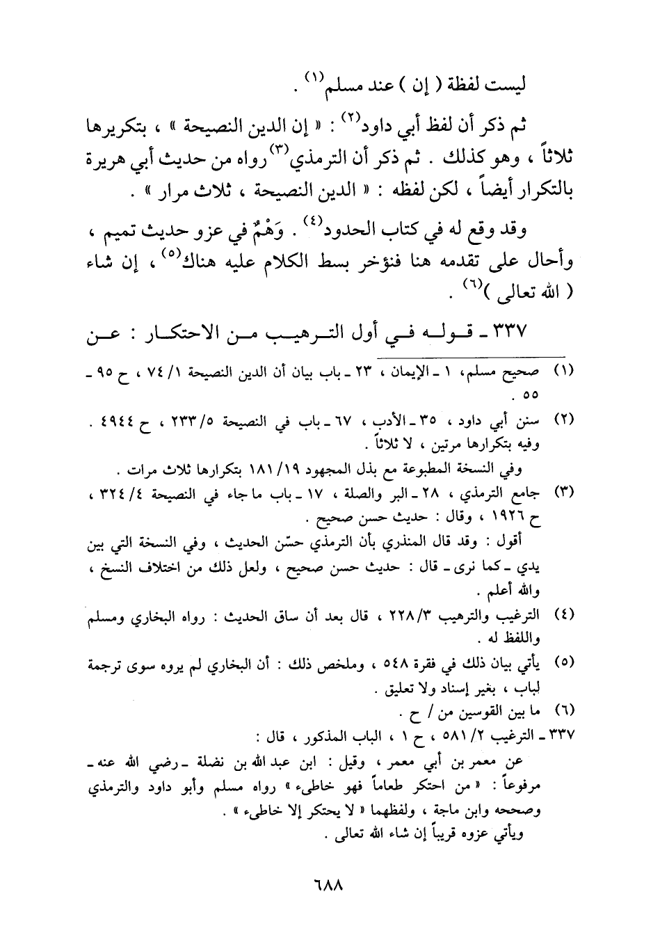 ثم ذكر أن لفظ أبي داود: "إن الدين النصيحة"، بتكريرها ثلاثاً، وهو كذلك. ثم ذكر أن الترمذي رواه من حديث أبي هريرة بالتكرار أيضاً، لكن لفظه: "الدين النصيحة، ثلاث مرار".