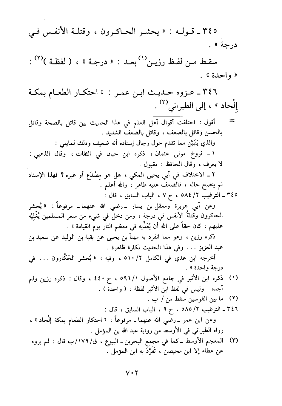٣٤٦ - عزوه حديث ابن عمر: "احتكار الطعام بمكة إِلْحاد"، إلى الطبراني.