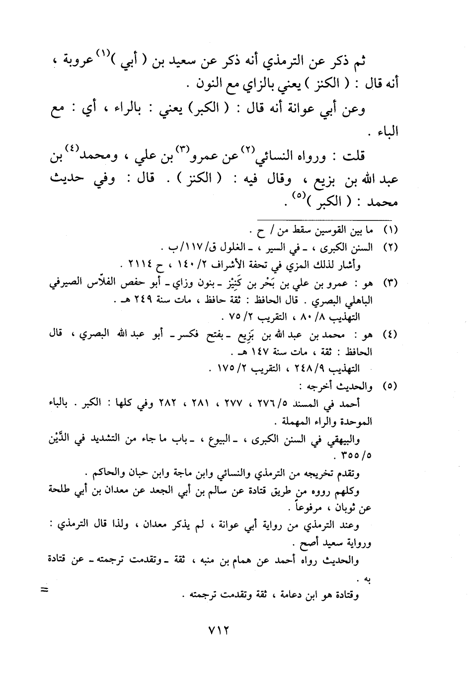 ثم ذكر عن الترمذي أنه ذكر عن سعيد بن (أبي) عروبة، أنه قال: (الكنز) يعني بالزاي مع النون.