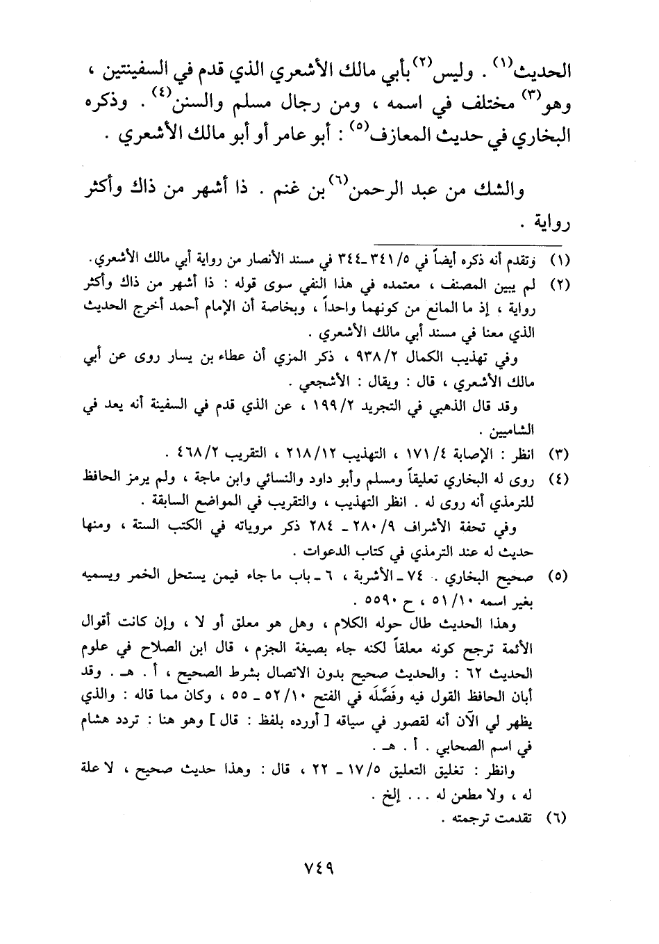 الحديث. وليس بأبي مالك الأشعري الذي قدم في السفينتين، وهو مختلف في اسمه، ومن رجال مسلم والسنن. وذكره البخاري في حديث المعازف: أبو عامر أو أبو مالك الأشعري.
