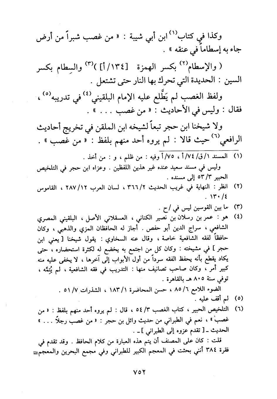 ولفظ الغصب لم يَطَّلع عليه الإمام البلقيني في تدريبه , فقال: وليس في الأحاديث: "من غصب ... ".