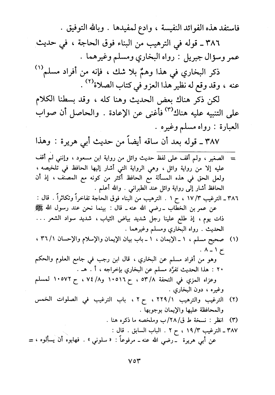 ٣٨٦ - قوله في الترهيب من البناء فوق الحاجة، في حديث عمر وسؤال جبريل: رواه البخاري ومسلم وغيرهما.