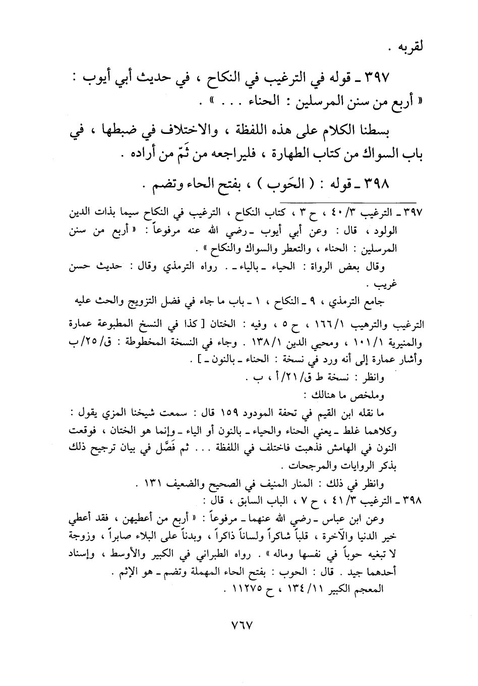 ٣٩٧ - قوله في الترغيب في النكاح، في حديث أبي أيوب: "أربع من سنن المرسلين: الحناء ... ".