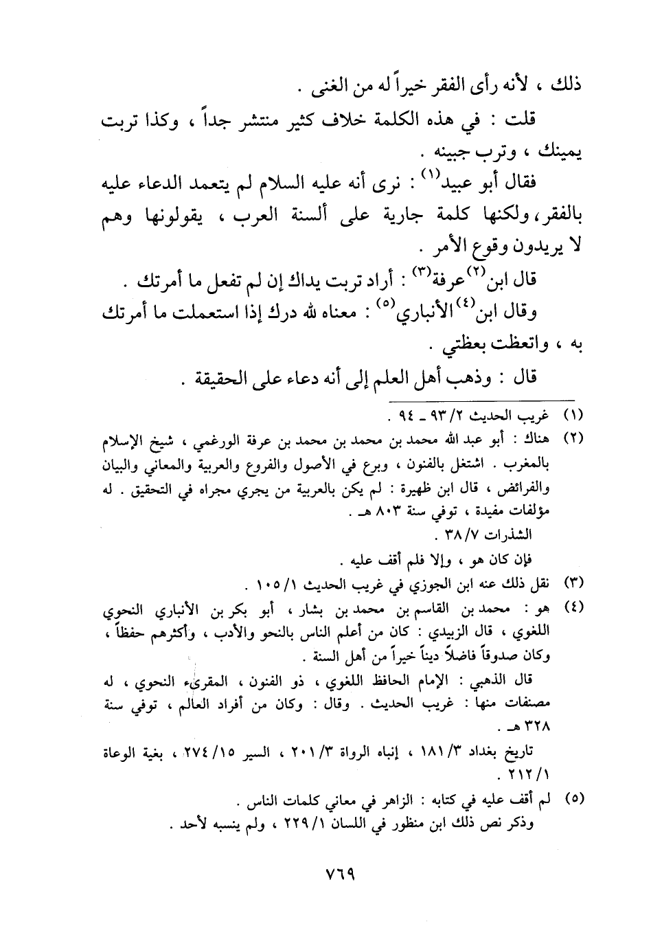 فقال أبو عبيد: نرى أنه عليه السلام لم يتعمد الدعاء عليه بالفقر، ولكنها كلمة جارية على ألسنة العرب، يقولونها وهم لا يريدون وقوع الأمر.