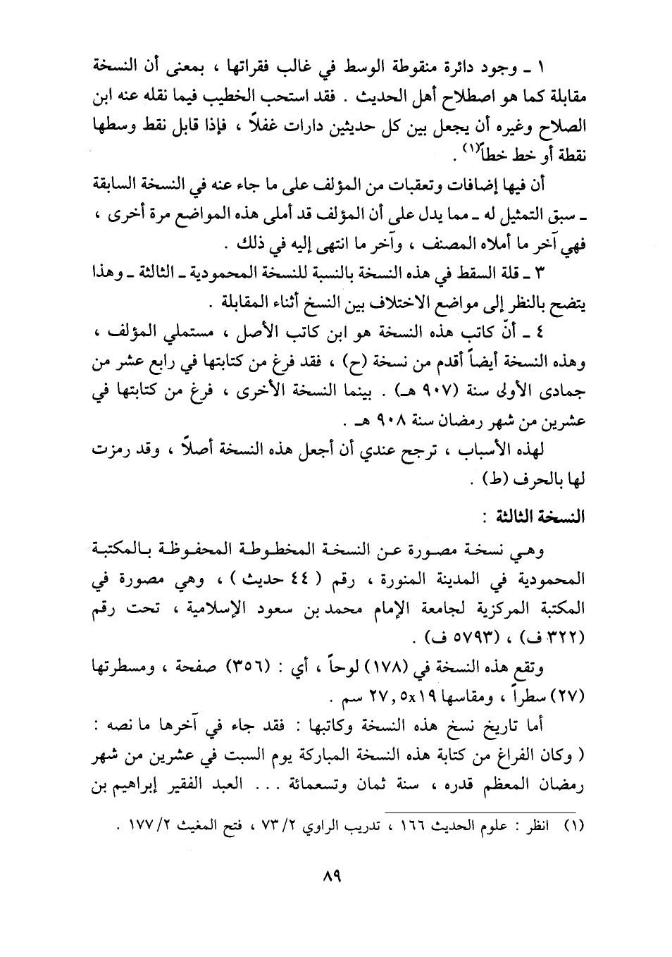 ٣ - قلة السقط في هذه النسخة بالنسبة للنسخة المحمودية -الثالثة- وهذا يتضح بالنظر إلى مواضع الاختلاف بين النسخ أثناء المقابلة.