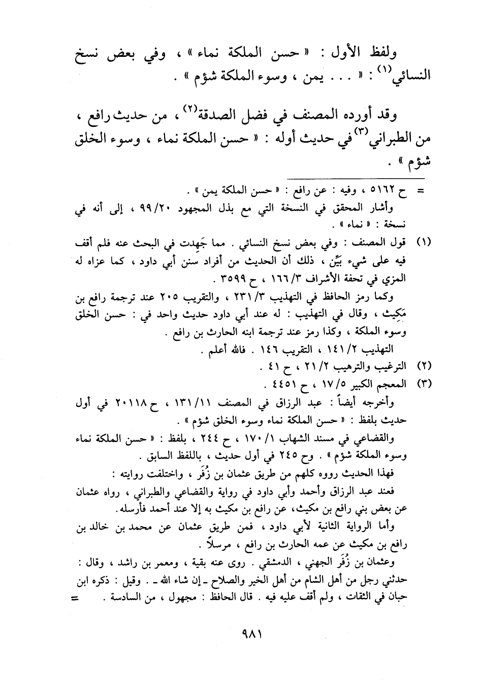 ولفظ الأول: "حسن الملكة نماء"، وفي بعض نسخ النسائي: " ... يمن، وسوء الملكة شؤم".