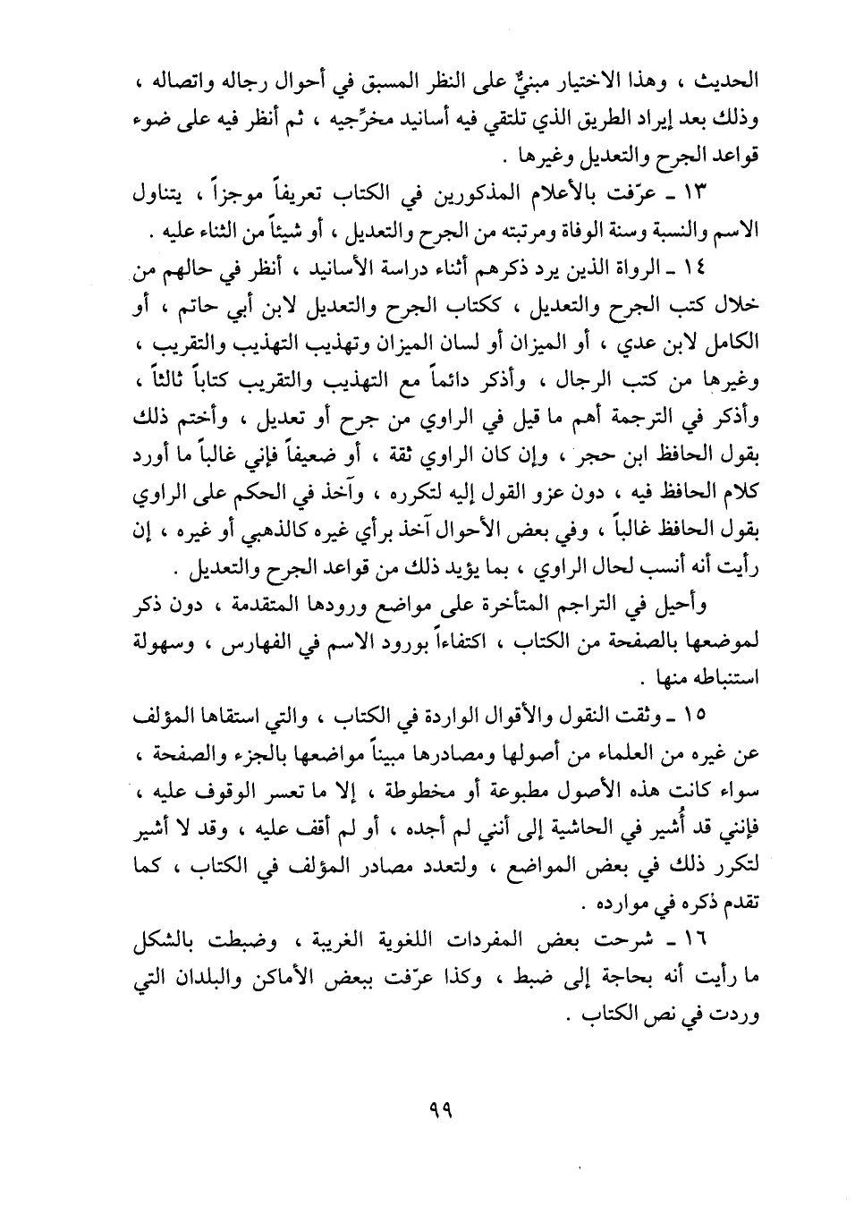 ١٣ - عرّفت بالأعلام المذكورين في الكتاب تعريفاً موجزاً، يتناول الاسم والنسبة وسنة الوفاة ومرتبته من الجرح والتعديل، أو شيئاً من الثناء عليه.