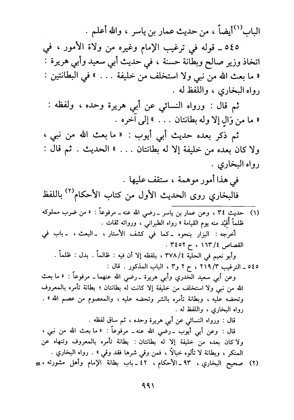 ٥٤٥ - قوله في ترغيب الإمام وغيره من ولاة الأمور، في اتخاذ وزير صالح وبطانة حسنة، في حديث أبي سعيد وأبي هريرة: "ما بعث الله من نبي ولا استخلف من خليفة ... " في البطانتين: رواه البخاري، واللفظ له.