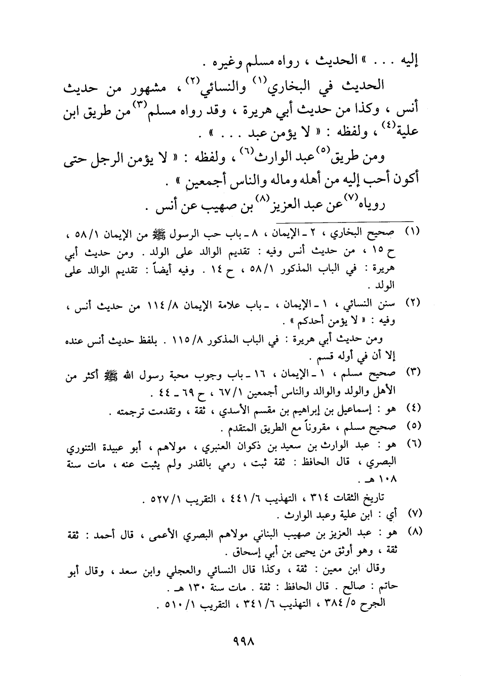 الحديث في البخاري والنسائي، مشهور من حديث أنس، وكذا من حديث أبي هريرة، وقد رواه مسلم من طريق ابن علية، ولفظه: "لا يؤمن عبد ... ".