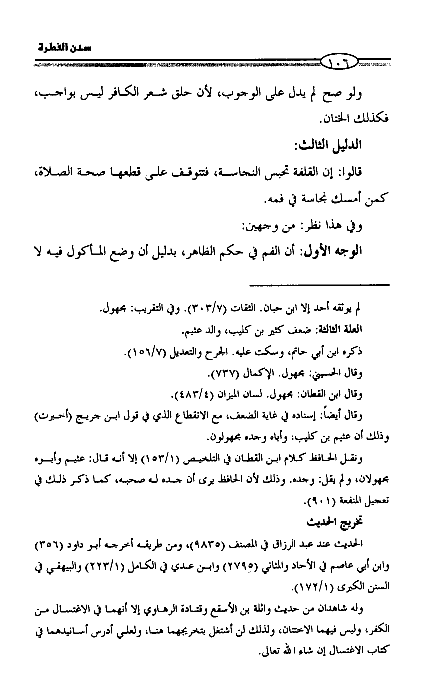 ونقل الحافظ كلام ابن القطان في التلخيص (١/ ١٥٣) إلا أنه قال: عثيم وأبوه مجهولان، ولم يقل: وجده. وذلك لأن الحافظ يرى أن جده له صحبه، كما ذكر ذلك في تعجيل المنفعة (٩٠١).