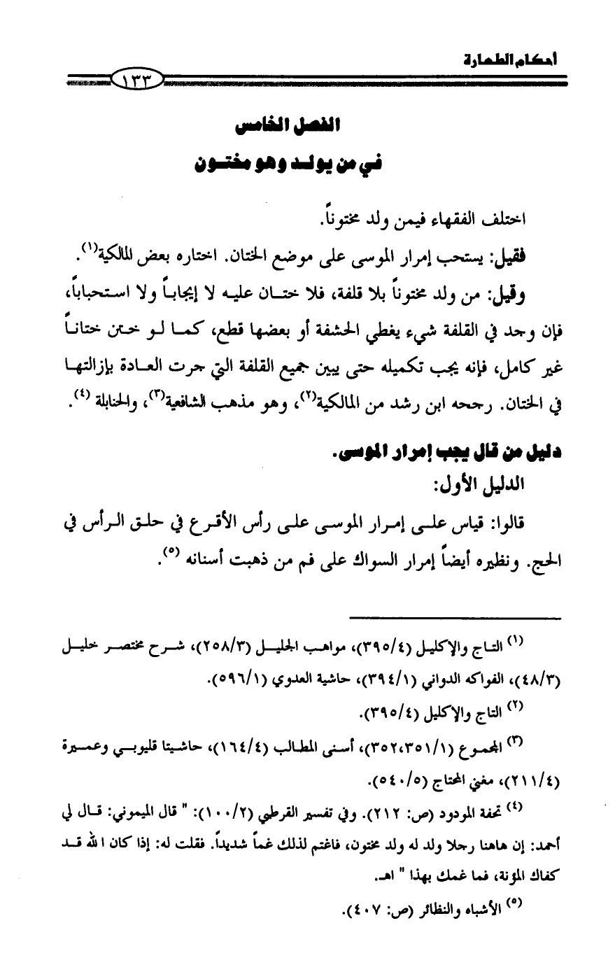 (¬٤) تحفة المودود (ص: ٢١٢). وفي تفسير القرطبي (٢/ ١٠٠): " قال الميموني: قال لي أحمد: إن هاهنا رجلا ولد له ولد مختون، فاغتم لذلك غماً شديداً. فقلت له: إذا كان الله قد كفاك المؤنة، فما غمك بهذا " اهـ.