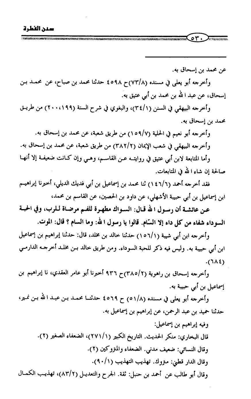 وأخرجه ابن أبي شيبة (1/ 156) حدثنا خالد بن مخلد، قال: حدثنا إبراهيم بن إسماعيل بن أبي حبيبة به. وليس فيه ذكر للحبة السوداء. ومن طريق خالد بن مخلد أخرجه الدارمي (684).