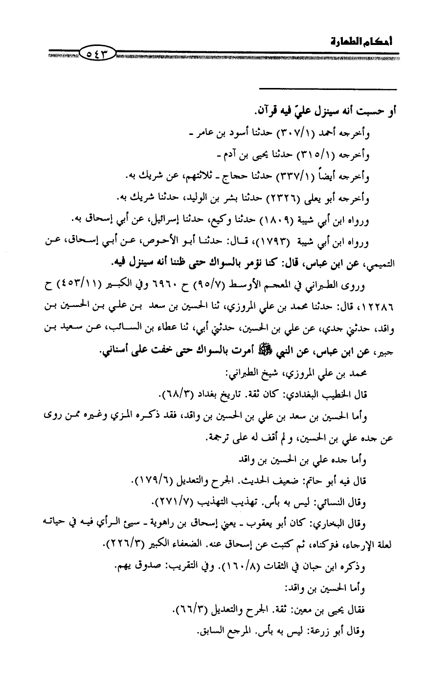 ورواه ابن أبي شيبة (1793)، قال: حدثنا أبو الأحوص، عن أبي إسحاق، عن التميمي، عن ابن عباس، قال: كنا نؤمر بالسواك حتى ظننا أنه سينزل فيه.