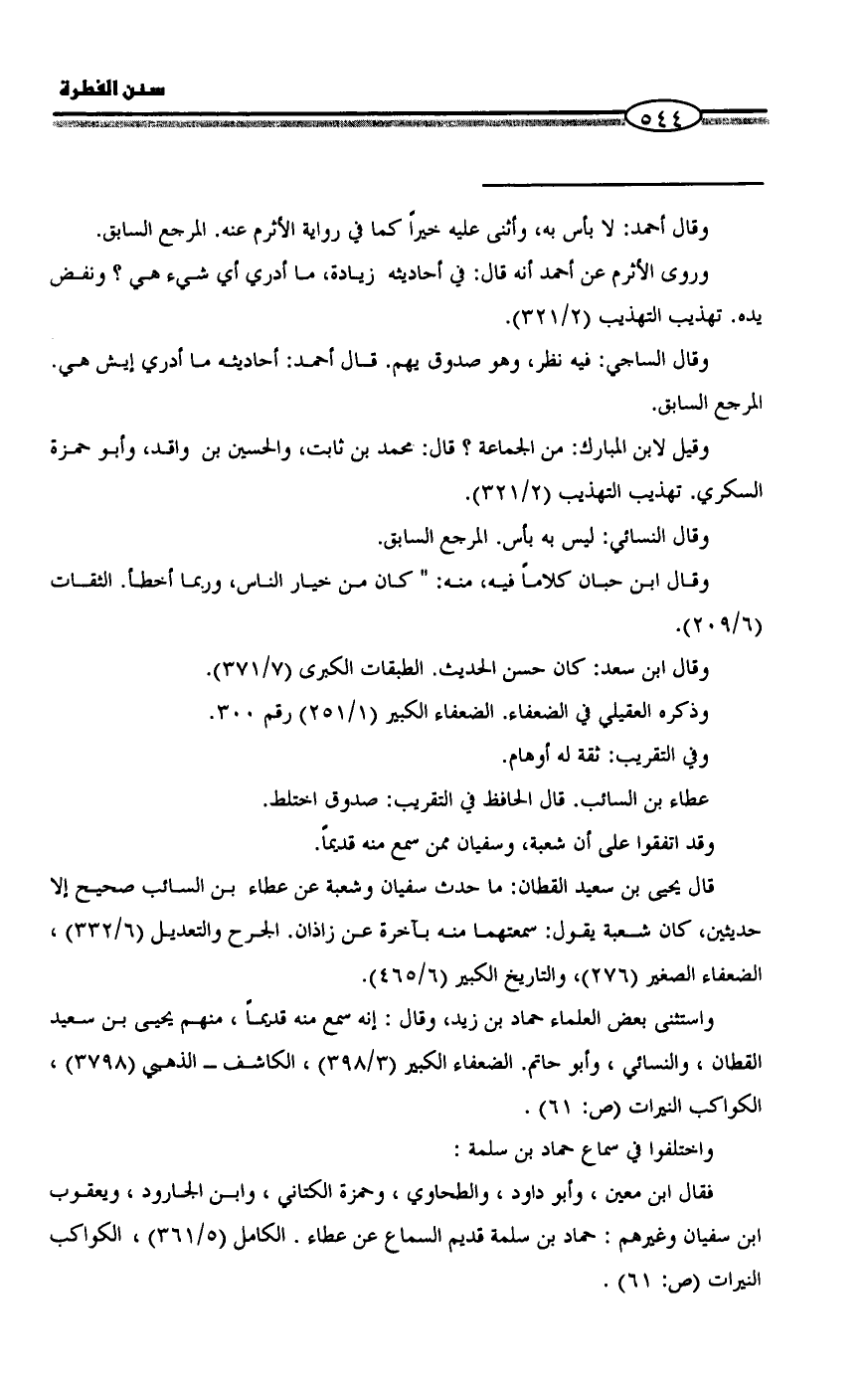 فقال ابن معين، وأبو داود، والطحاوي، وحمزة الكتاني، وابن الجارود، ويعقوب ابن سفيان وغيرهم: حماد بن سلمة قديم السماع عن عطاء. الكامل (5/ 361)، الكواكب النيرات (ص: 61). =