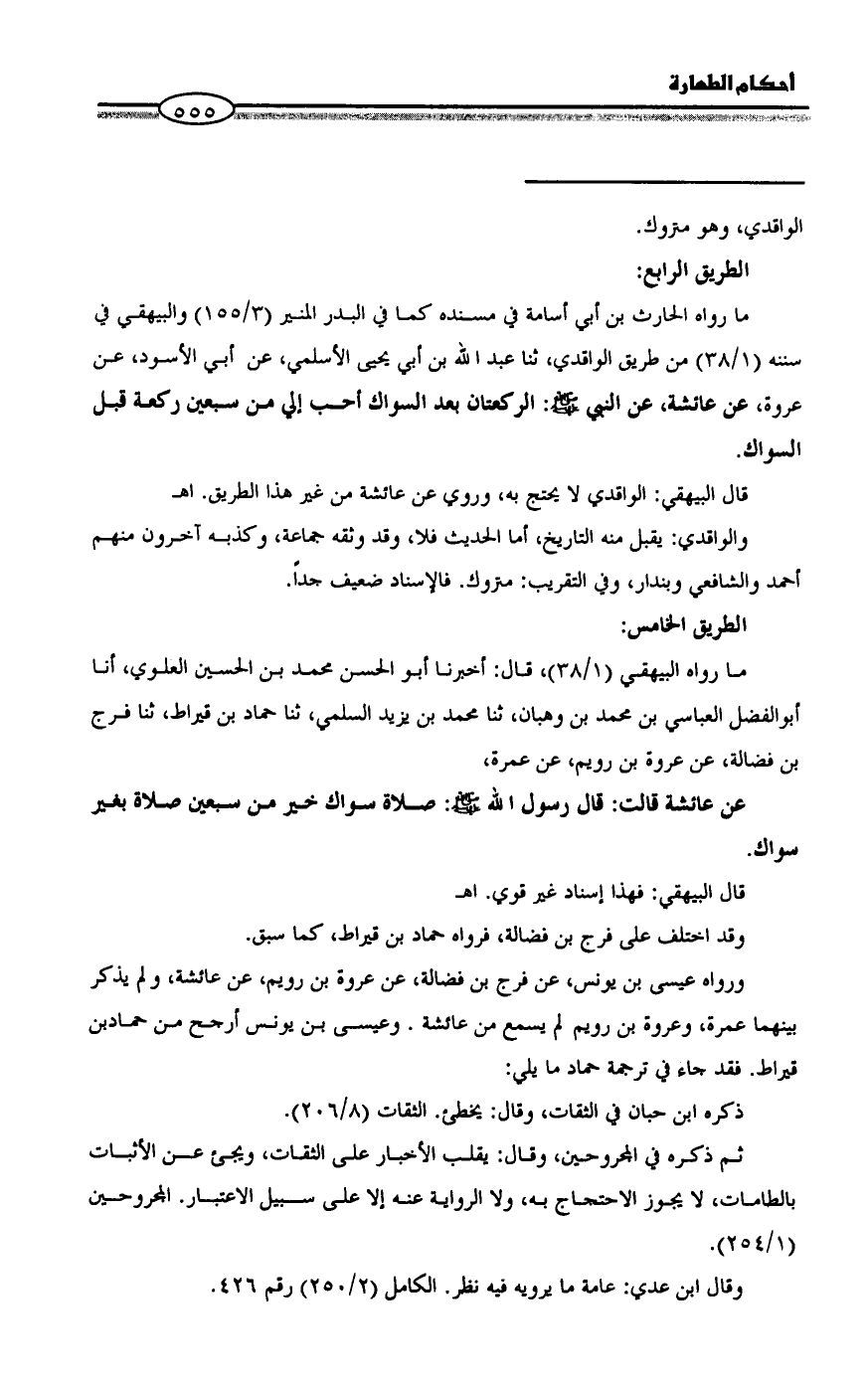ما رواه الحارث بن أبي أسامة في مسنده كما في البدر المنير (3/ 155) والبيهقي في سننه (1/ 38) من طريق الواقدي، ثنا عبد الله بن أبي يحيى الأسلمي، عن أبي الأسود، عن عروة، عن عائشة، عن النبي - صلى الله عليه وسلم -: الركعتان بعد السواك أحب إلي من سبعين ركعة قبل السواك.