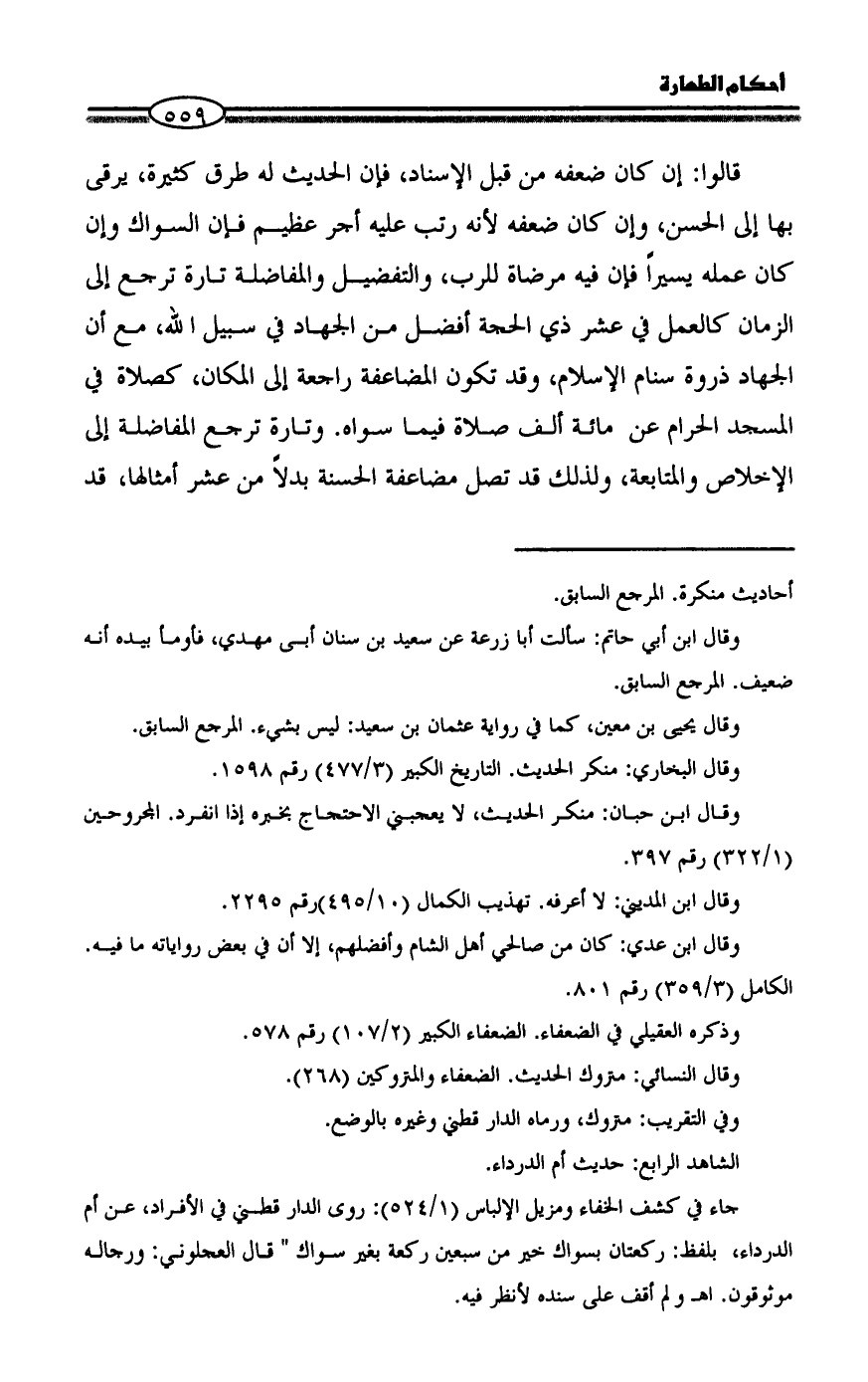 قالوا: إن كان ضعفه من قبل الإسناد، فإن الحديث له طرق كثيرة، يرقى بها إلى الحسن، وإن كان ضعفه لأنه رتب عليه أجر عظيم فإن السواك وإن كان عمله يسيراً فإن فيه مرضاة للرب، والتفضيل والمفاضلة تارة ترجع إلى الزمان كالعمل في عشر ذي الحجة أفضل من الجهاد في سبيل الله، مع أن الجهاد ذروة سنام الإسلام، وقد تكون المضاعفة راجعة إلى المكان، كصلاة في المسجد الحرام عن مائة ألف صلاة فيما سواه. وتارة ترجع المفاضلة إلى الإخلاص والمتابعة، ولذلك قد تصل مضاعفة الحسنة بدلاً من عشر أمثالها، قد