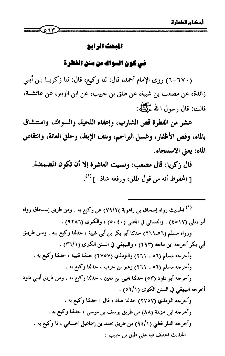(670 - 6) روى الإمام أحمد، قال: ثنا وكيع، قال: ثنا زكريا بن أبي زائدة، عن مصعب بن شيبة، عن طلق بن حبيب، عن ابن الزبير، عن عائشة، قالت: قال رسول الله - صلى الله عليه وسلم -: