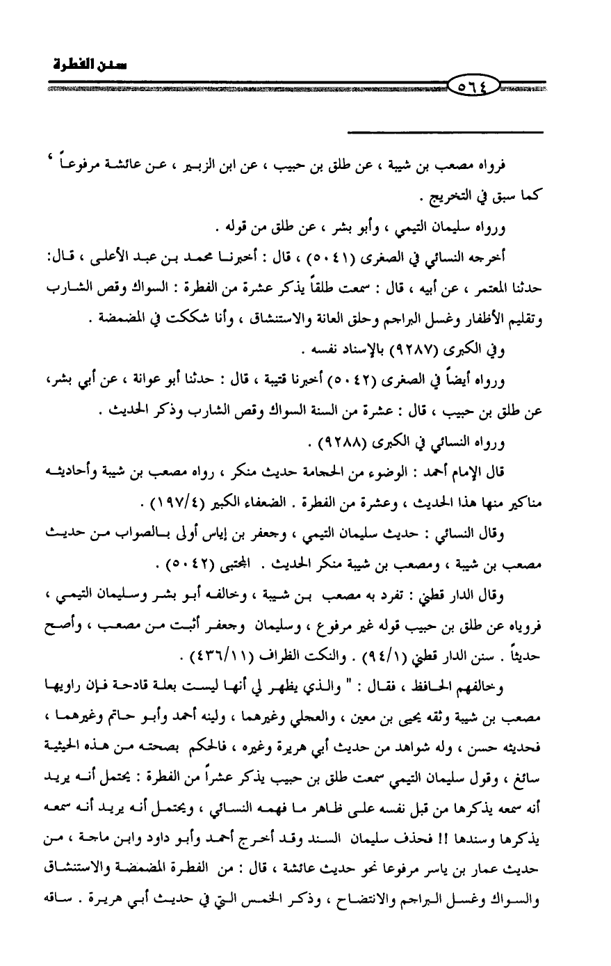 وخالفهم الحافظ، فقال: " والذي يظهر لي أنها ليست بعلة قادحة فإن راويها مصعب بن شيبة وثقه يحيى بن معين، والعجلي وغيرهما، ولينه أحمد وأبو حاتم وغيرهما، فحديثه حسن، وله شواهد من حديث أبي هريرة وغيره، فالحكم بصحته من هذه الحيثية سائغ، وقول سليمان التيمي سمعت طلق بن حبيب يذكر عشراً من الفطرة: يحتمل أنه يريد أنه سمعه يذكرها من قبل نفسه على ظاهر ما فهمه النسائي، ويحتمل أنه يريد أنه سمعه يذكرها وسندها!! فحذف سليمان السند وقد أخرج أحمد وأبو داود وابن ماجة، من حديث عمار بن ياسر مرفوعاً نحو حديث عائشة، قال: من الفطرة المضمضة والإستنشاق والسواك وغسل البراجم والإنتضاح، وذكر الخمس التي في حديث أبي هريرة. ساقه =