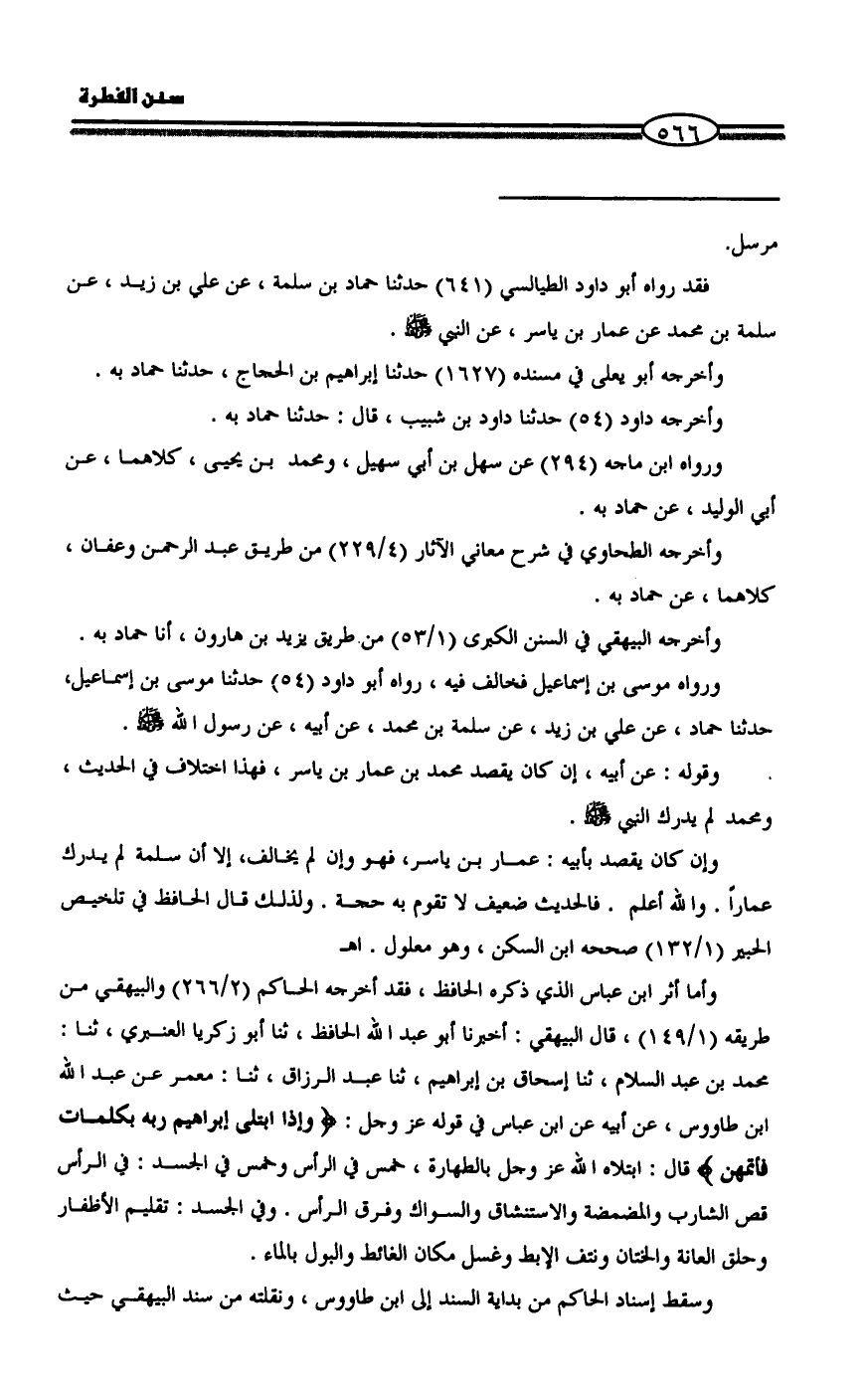 وأما أثر ابن عباس الذي ذكره الحافظ، فقد أخرجه الحاكم (2/ 266) والبيهقي من طريقه (1/ 149)، قال البيهقي: أخبرنا أبو عبد الله الحافظ، ثنا أبو زكريا العنبري، ثنا: محمد بن عبد السلام، ثنا إسحاق بن إبراهيم، ثنا عبد الرزاق، ثنا: معمر عن عبد الله ابن طاووس، عن أبيه عن ابن عباس في قوله عز وجل: {وَإِذِ ابْتَلَى إِبْرَاهِيمَ رَبُّهُ بِكَلِمَاتٍ فَأَتَمَّهُنَّ} قال: ابتلاه الله عز وجل بالطهارة، خمس في الرأس وخمس في الجسد: في الرأس قص الشارب والمضمضة والإستنشاق والسواك وفرق الرأس. وفي الجسد: تقليم الأظفار وحلق العانة والختان ونتف الإبط وغسل مكان الغائط والبول بالماء.